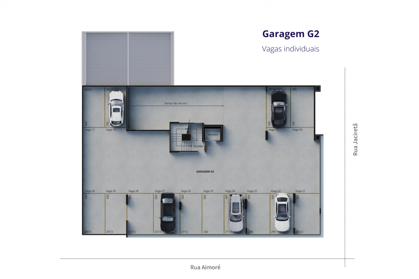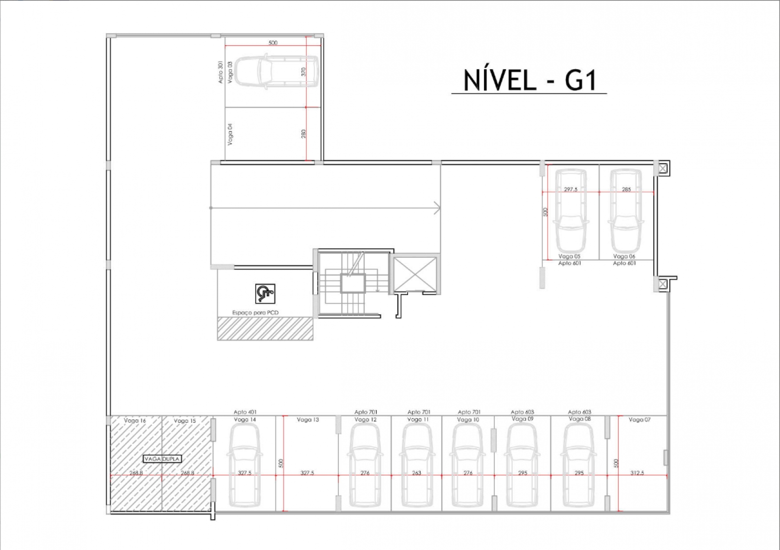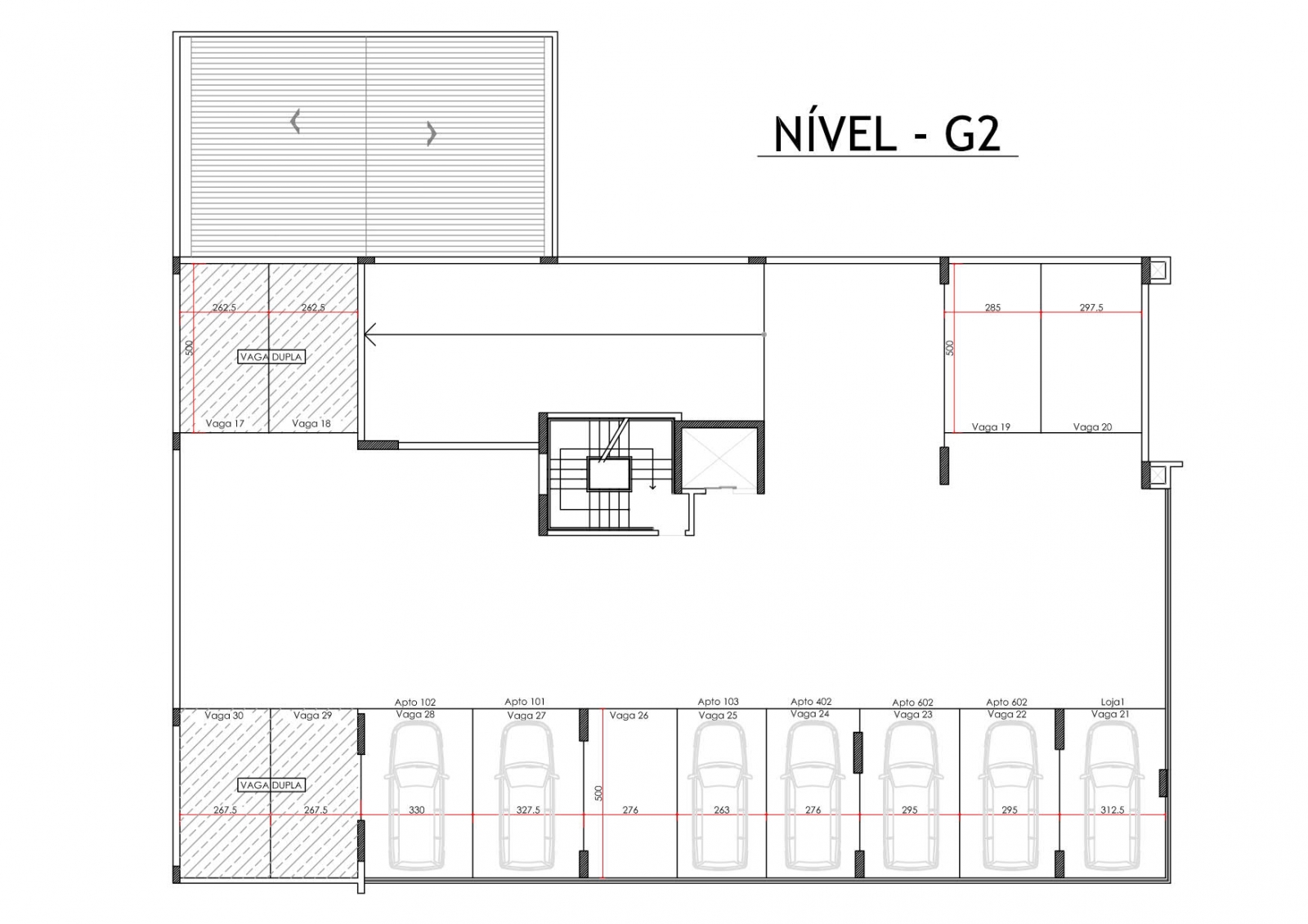 7 pavimentos de apartamentos, 2 pavimentos de garagem elevada e térreo com salas comerciais.