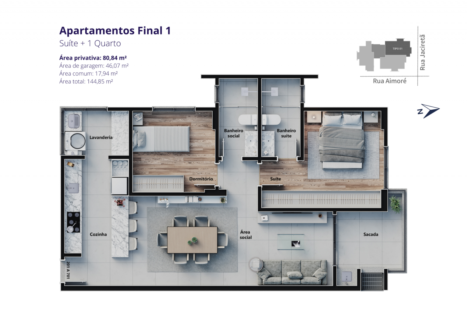 Apartamentos com acabamentos de primeira linha em uma planta com ótimo aproveitamento dos espaços.
