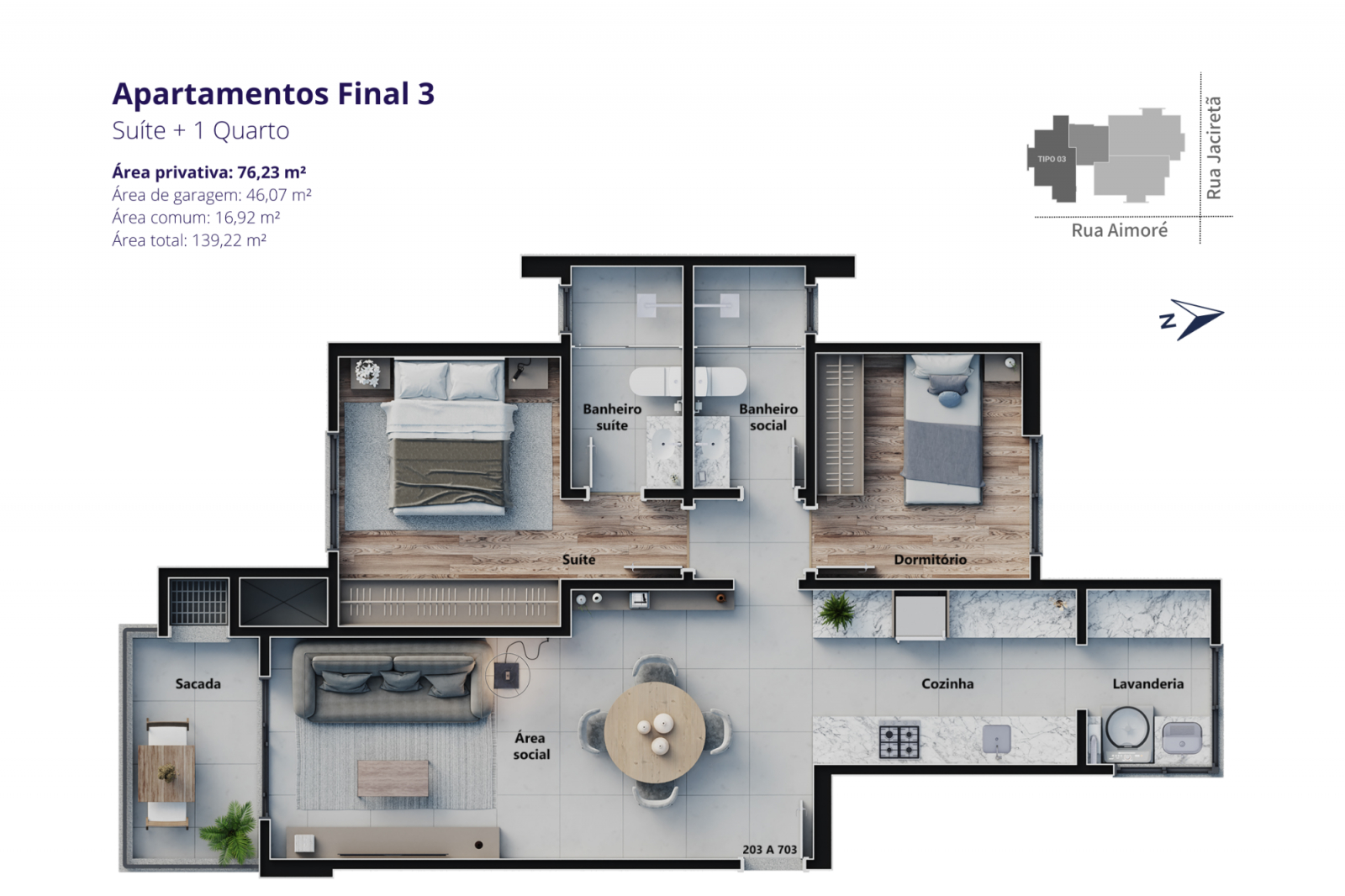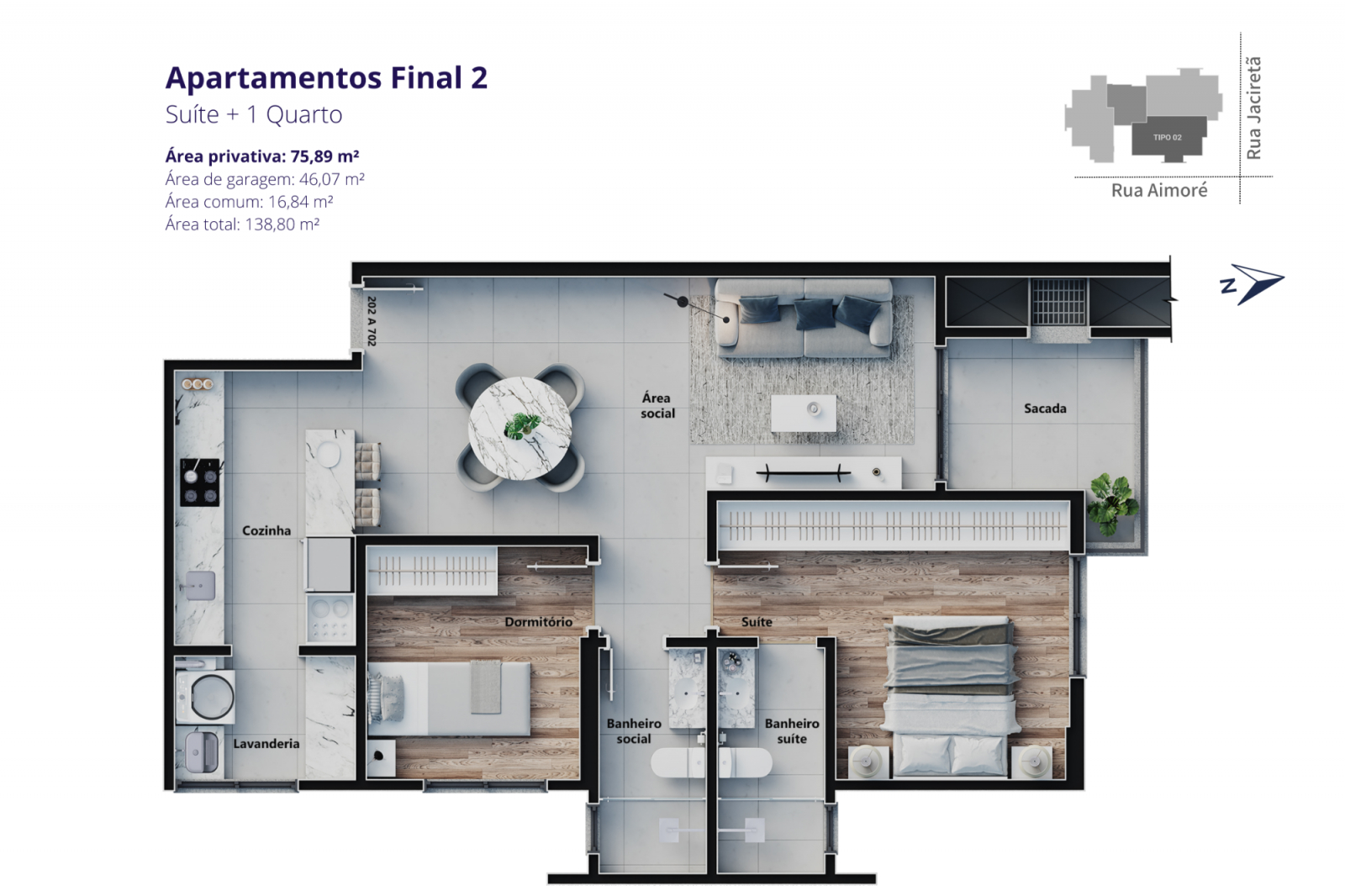 3 opções de plantas a partir de 75,89 m² de área privativa.